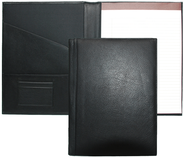 Features: Premium top-grain foam padded leather covers, completely hand stitched and turned edges. Interior pockets, and a document flap on the inside. Both top-loading and side-loading slots on the inside right pocket. Pen slot (no pen included).