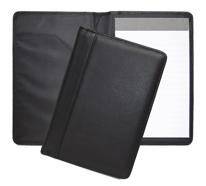 Features: Black genuine leather junior padfolio has hand-stitched, padded covers, with turned edges. Inside has taffeta lining. Has a stitched business card pocket, a stitched slash pocket, and a pen slot on the inside as well. A 5" x 8" writing pad is included.